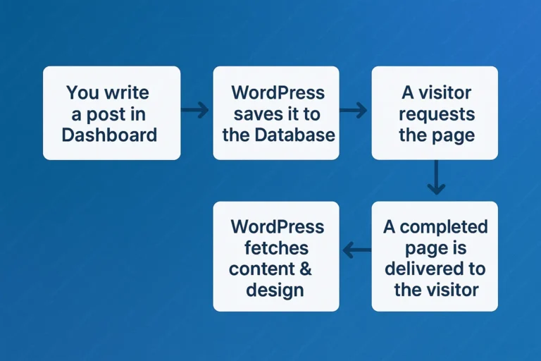 So, to bring it all home: You manage your content through a simple, intuitive Dashboard (the back-end). WordPress stores that content in a powerful Database. When a visitor arrives, WordPress (the Core Software) instantly fetches your content, wraps it in your chosen Theme’s design, and delivers a finished webpage (the Front-End).